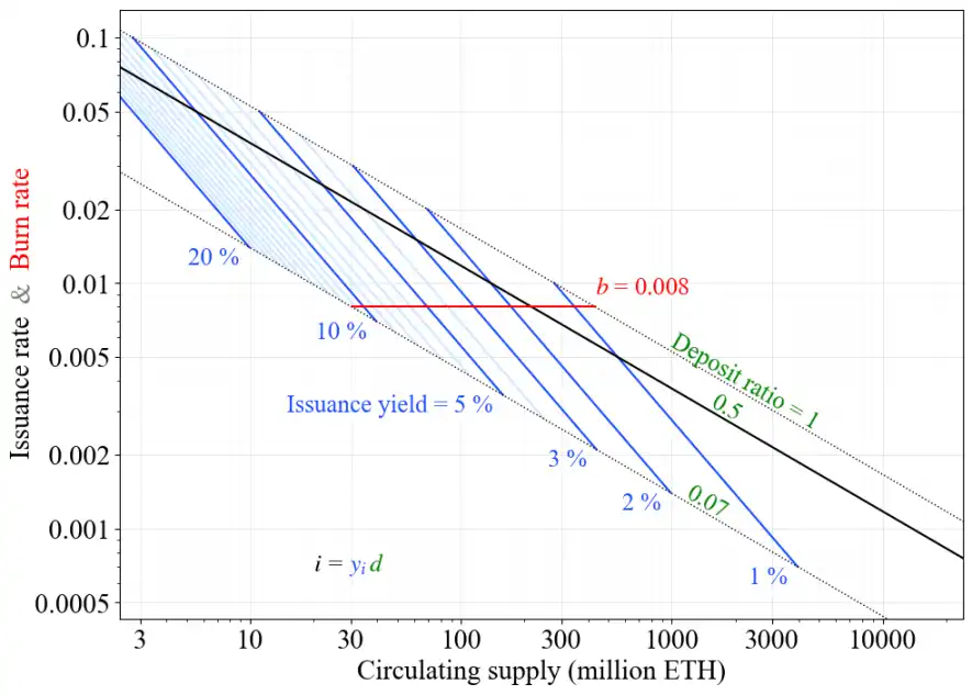 由于根据当前奖励曲线,发行量 i 可以表示为 i=cFd/S,它会随着流通供给的变化而变化(抵押率 d 提供了一定的调节空间)。图示展示了以太坊的发行率对角线和自合并以来的平均 b。