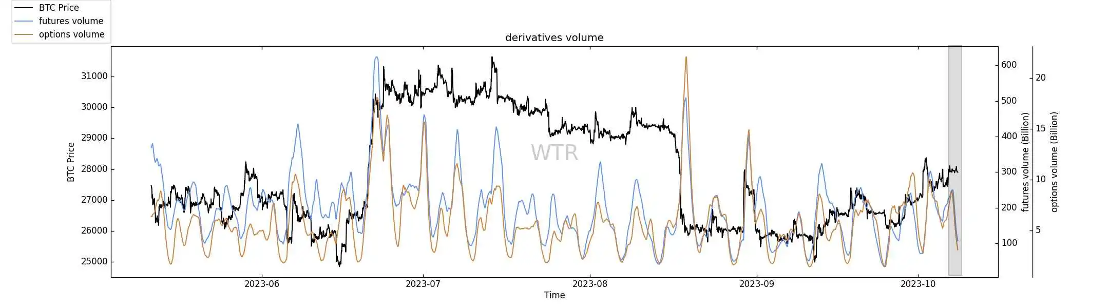 但当前衍⽣品成交量⽆太多波动仍处于低位⽔平,表明当前衍⽣品交易者持观望状态较多,但也预⽰ 着距离波动不远。