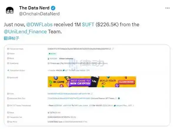 DWF Labs 收到 UniLend Finance 团队转入的 100 万枚 UFT