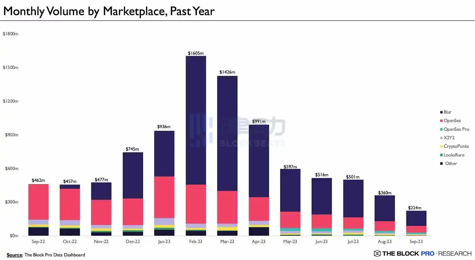 据 The Block 数据,9 月 NFT 交易量达 2.24 亿美元,环比下降 37%,连续第七个月交易量萎缩,月交易量已跌至两年低点。 此外,9 月 NFT 市场的总交易笔数略有增加,从 483,000 笔增至 504,000 笔。