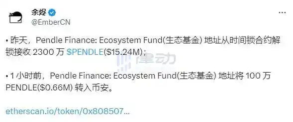 据余烬监测,Pendle Finance 生态基金于 1 小时前将 100 万枚 PENDLE(价值约合 66 万美元)转入 Binance。 此外,该地址昨日从时间锁合约解锁接收 2300 万枚 PENDLE(价值约合 1524 万美元)。