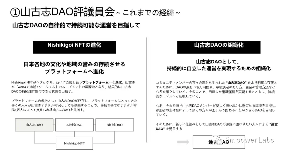 不过项目的运营并不容易,运营主要由当地志愿组织山越居民委员会负责,在 2022 年底的复盘中,团队坦言发展的不顺利,他们把目光放在了全球社区,然而「边缘村庄的生存」和「区域振兴」的观点过于高语境,不适合全球使用。随后他们根据这一年运营中的收获,构想了新的方向。把数字村民的概念拓展到更多地域以形成网络效应,同时也形成了更有效的 DAO 运营结构。