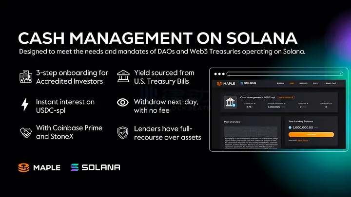 Maple Finance 是加密货币领域最大的机构资本市场之一,宣布将携现金管理产品重返 Solana。在 Solana 上推出现金管理产品的短短几天内,它就吸引了超过 420 万美元,并且预计将继续增长。以下是 Maple 现金管理产品的工作原理: