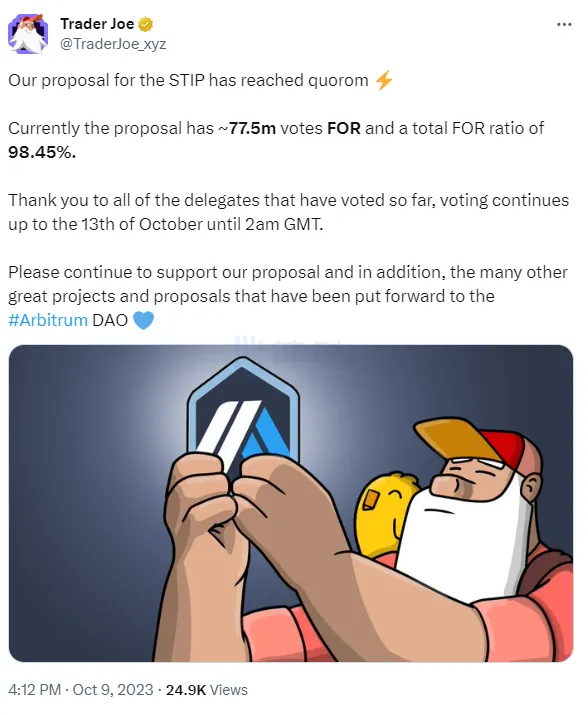 9 月 26 日,Trader Joe 在 Arbitrum 社区发布提案,向 Arbitrum DAO 财库申请 183 万枚 ARB 拨款,随后,Trader Joe 将数量下调至 151 万枚,这笔拨款用于提高现货流动性和交易效率。目前,该提案的投票支持率为 98.45%。