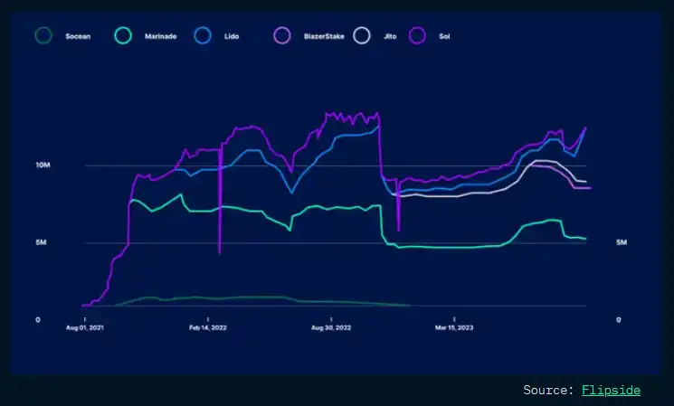 Marinade Finance 仍然占据 Solana 流动性质押领域的大部分市场份额,锁定了超过 547 万枚 SOL 代币,其次是 Lido 和 Jito。值得注意的是,Marinade、Socean、Lido、BlazeStake、Jito 等更多的流动性质押协议开始涌现,并都提供不同的奖励计划,以吸引更多的用户抵押 SOL 代币。