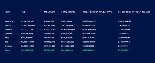 「DeFi Velocity」指标值即「24 小时 DEX 交易量/区块链 TVL」,数值越高,代表 DeFi 生态系统越活跃。以 Solana 为例,每 1 美元的流动性,每周的交易量大约为 0.71 倍(截至 2023 年 10 月 2 日)。与 Arbitrum、Binance、Base、Optimism、Ethereum 等网络相比,Solana 在过去 24 小时和 7 天内还提供了最高的 DeFi Velocity。有趣的是,一些链报告的 TVL 数字更高,但 DeFi 资金使用率远低于 Solana,表明链上经济活动较低。
