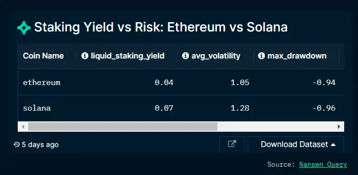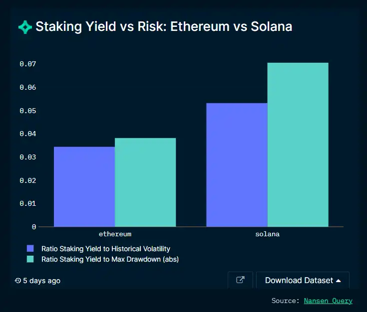 以太坊上的权益与 Solana 上的权益相比如何?我们研究了 Lido 在这两个链上的流动性质押,以及历史平均波动率、最大回撤和风险回报比。目前,对于非常相似的风险配置,Solana 的投资收益几乎是以太坊的两倍。