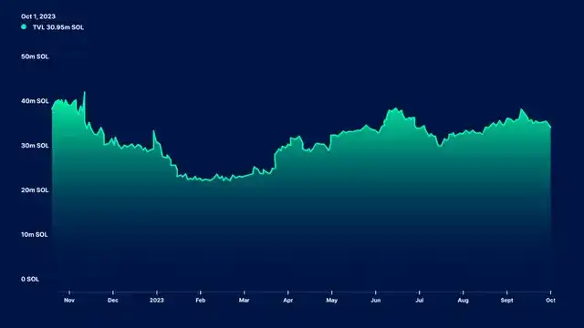 说到「新来者」,Jito 在 2023 年 10 月 2 日达到了历史最高的总锁定价值(ATH TVL)为 5750 万美元,目前有 240 万枚 SOL 代币被质押,自推出以来一直处于上升趋势。在第三季度,总锁定价值(TVL)增长了 100%,从 74 万枚 SOL 增加到 162 万枚 SOL。