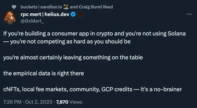 在构建面向消费者的应用程序时,Solana 已被证明是最可用的链。区块链提供了一个成熟的技术堆栈,针对散户采用进行了优化。Solana 的 cNFT 适用于大规模 NFT 铸币,经过优化尽可能低成本,本地费用市场旨在消除网络中不必要的拥堵,而高 TPS 环境提供了驱动这些应用程序所需的速度。