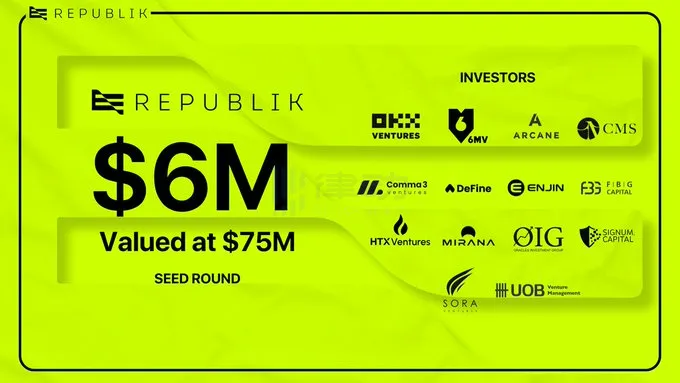 RepubliK 曾在2023 年 3 月完成 370 万美元种子轮融资,估值为 7500 万美元。当时 alpha 版本注册用户已超过 8.5 万人。10 月 11 日,RepubliK 以 7500 万估值完成 600 万美元种子轮融资,由 OKX Ventures、HTX Ventures、6MV 等参投。