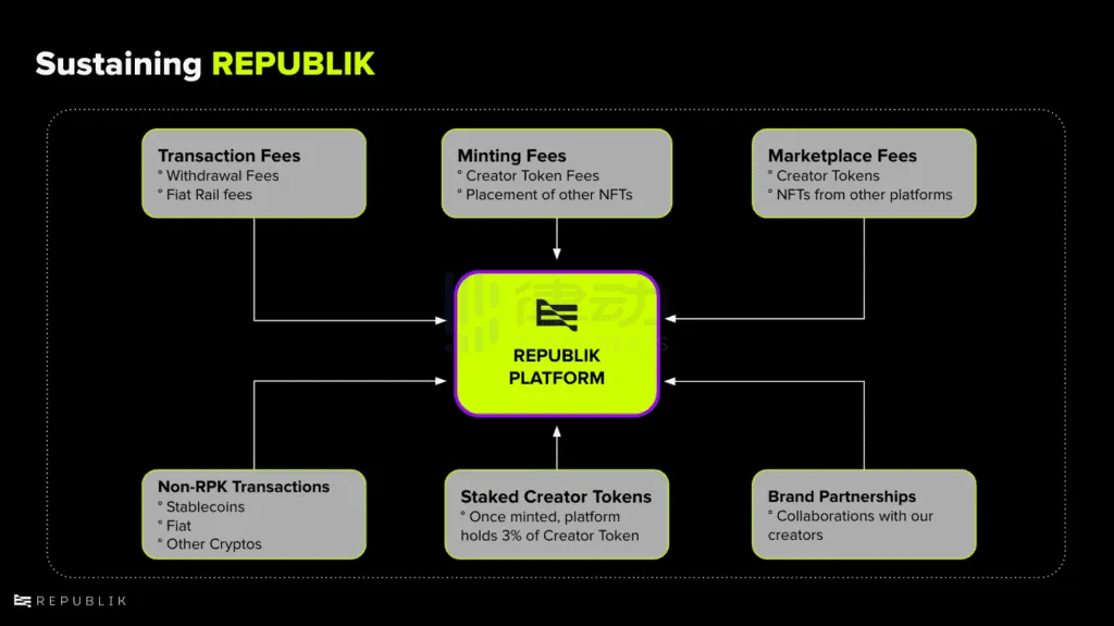 RepubliK 生态中,创作者将承诺将他们所拥有的创作者代币中的 3% 放入一个共享池中。这 3% 代币所产生的分红(或收入)以及来自虚拟表演平台的任何其他收入都会被支付给 RepubliK 平台。