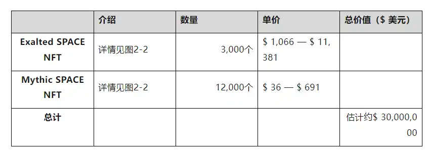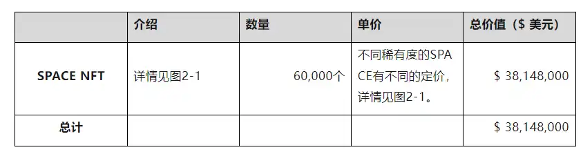 此次是 SPACE NFT 的首次销售,团队将出售 60,000 个 SPACE NFT(占其总供应量的 10%),详情如下: