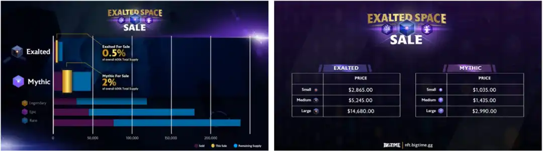 Big Time 在此次 Exalted SPACE 特卖活动中,一共出售了 3,000 个 Exalted SPACE NFT(占 SPACE NFT 总量的 0.5%)和 12,000 个 Mythic SPACE NFT(占 SPACE NFT 总量的 2%),如上图(右)所示。