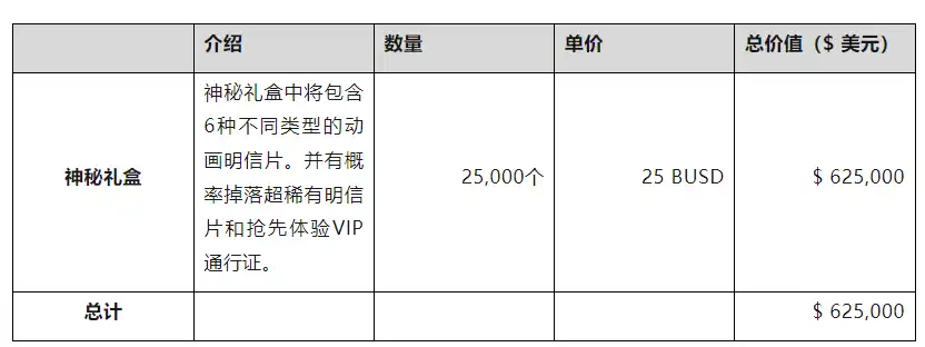 此次销售,每个神秘盒子单价为 25 BUSD,总计价值$ 625,000。