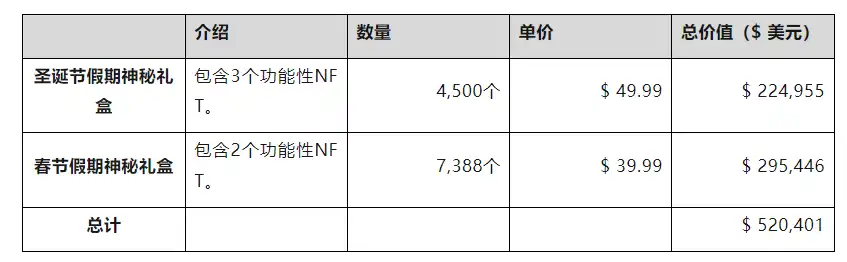 圣诞节假期神秘礼盒将售价 49.99 USD,春节假期神秘礼盒将售价 39.99 USD,用户最多可以一次性购买 100 个神秘礼盒,售出所有的神秘礼盒将为团队带来将近 52 万美元的资金收入。