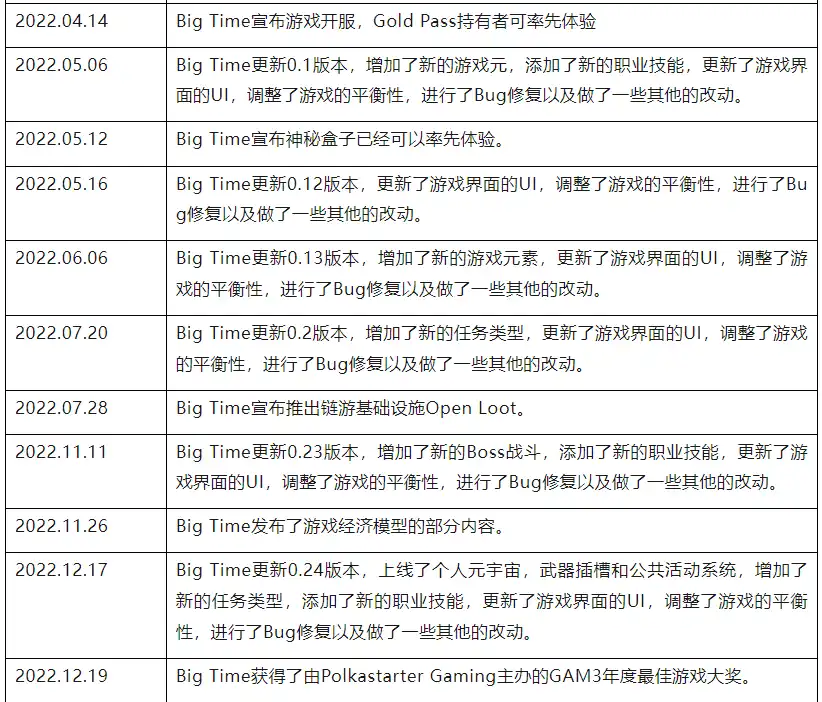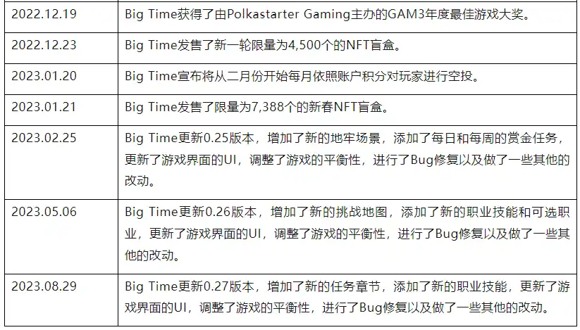 从团队来看,Big Time 团队拥有在游戏和加密领域扎实的背景,核心成员均有开发过大型游戏或者在大型游戏公司任职的经验。与 2022 年 5 月的第一篇研报时相比,Big Time 的核心团队成员有了一些变动,其中产品总监和游戏经济模型设计总监的离职可能对游戏的开发和交付产生了一定程度的影响,后续工作均由其他深耕游戏行业的专家接手。此外由于 Big Time Studios 是一家在世界范围内完全远程办公的游戏工作室,因此也会对游戏的按时交付产生一定程度的影响。