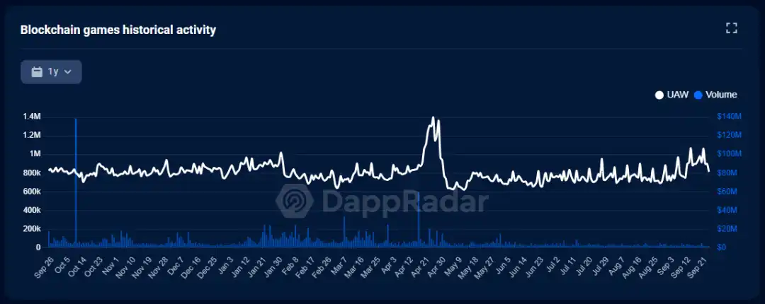 根据 DappRader 和 Footprint 的数据,截至 2023 年 9 月 25 日,链游赛道过去一年的唯一活跃钱包(UAW)数量基本维持在了 80 万个附近,虽然相比较 Big Time 第一篇研报时平均每日 120 万左右下降了超过 30%,但总体上来讲链游的核心玩家并没有出现明显的流失。一旦市场总体回暖,链游市场将有重新复苏的基础。