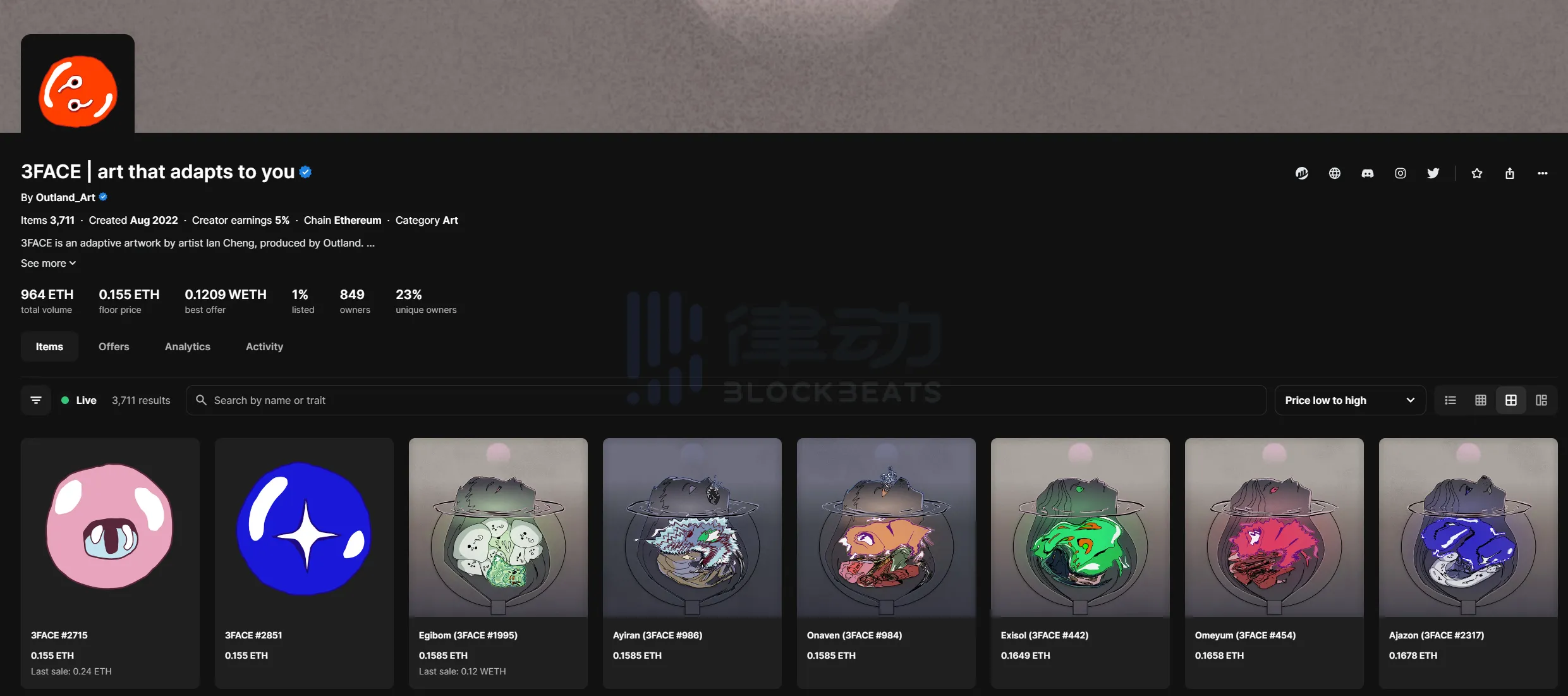 而反观 Ian Cheng 的「3FACE」则只从 0.138 ETH 涨到了 0.155 ETH,成交量只有接近 6 ETH 左右,与「Unsupervised—Machine Hallucinations—MoMA Dreams」比都有着不小的差距。