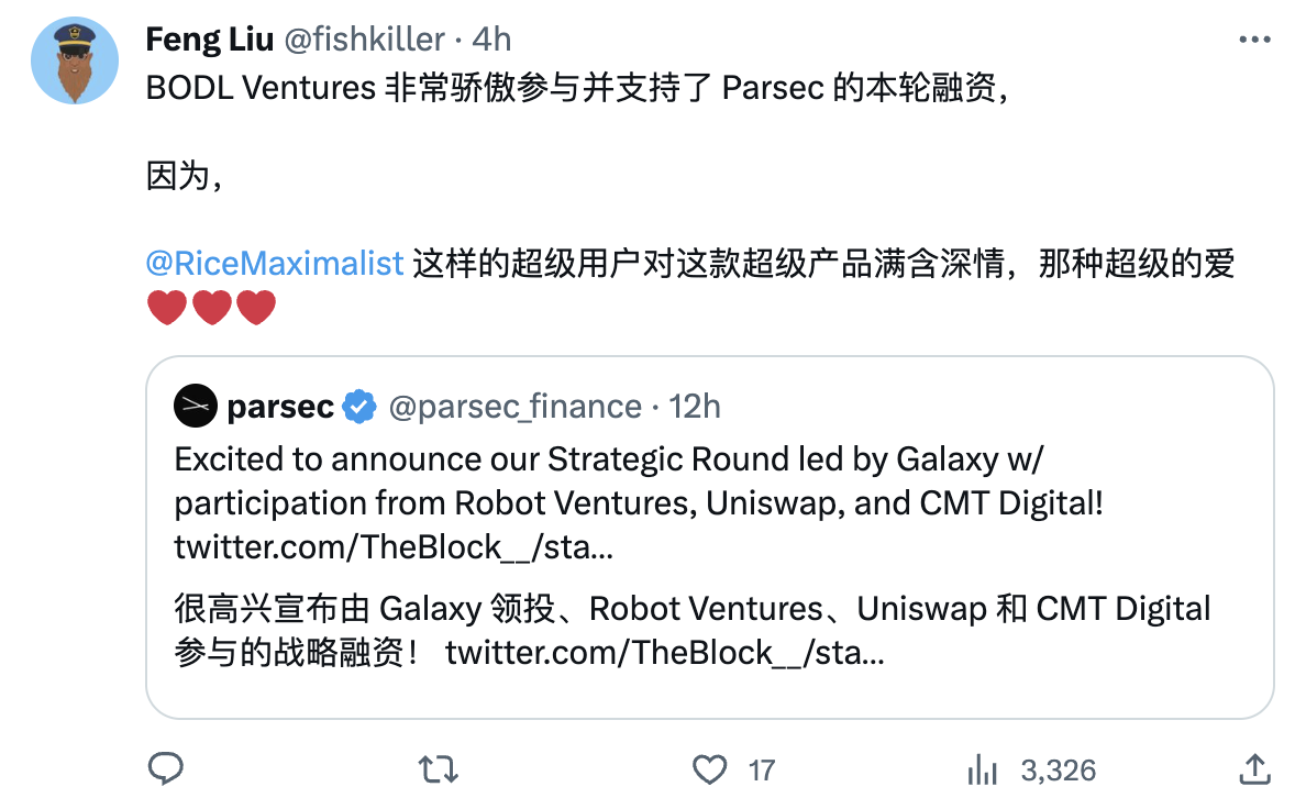 BODL Ventures 合伙人刘锋在社交平台上也发文表达出了对 Parsec 的赞同。
