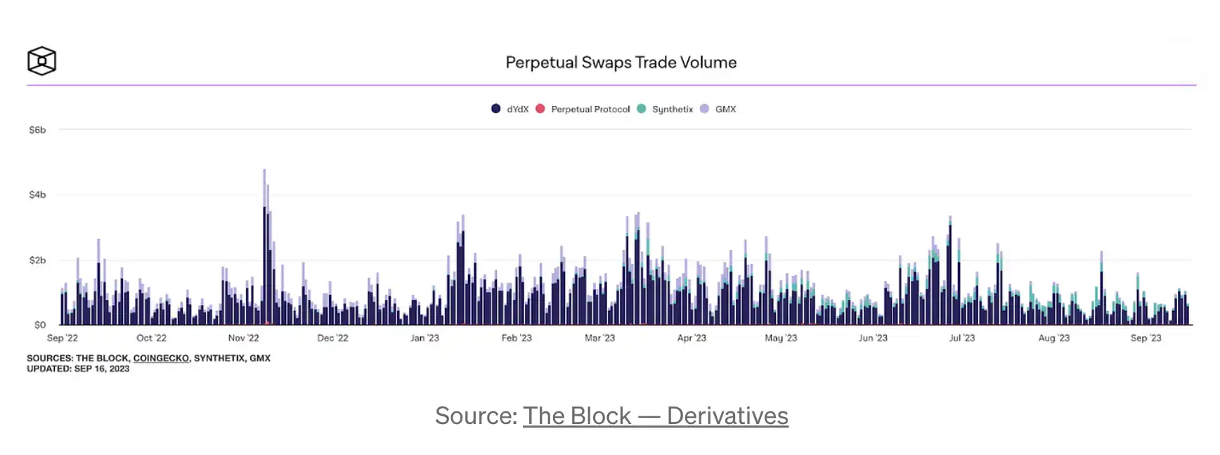 尽管如此,dYdX 目前仍然是去中心化永续合约领域的明显市场领导者,其低费用、深度流动性和在不同波动时期经过实战检验的模型。在 2022 年 11 月 FTX 崩溃的直接后果中,dYdX 用户数量增加了 39%。从那时起,dYdX 的平均月交易量也在增加,表明它们为 CEX 交易者提供了一个不错的替代选择。