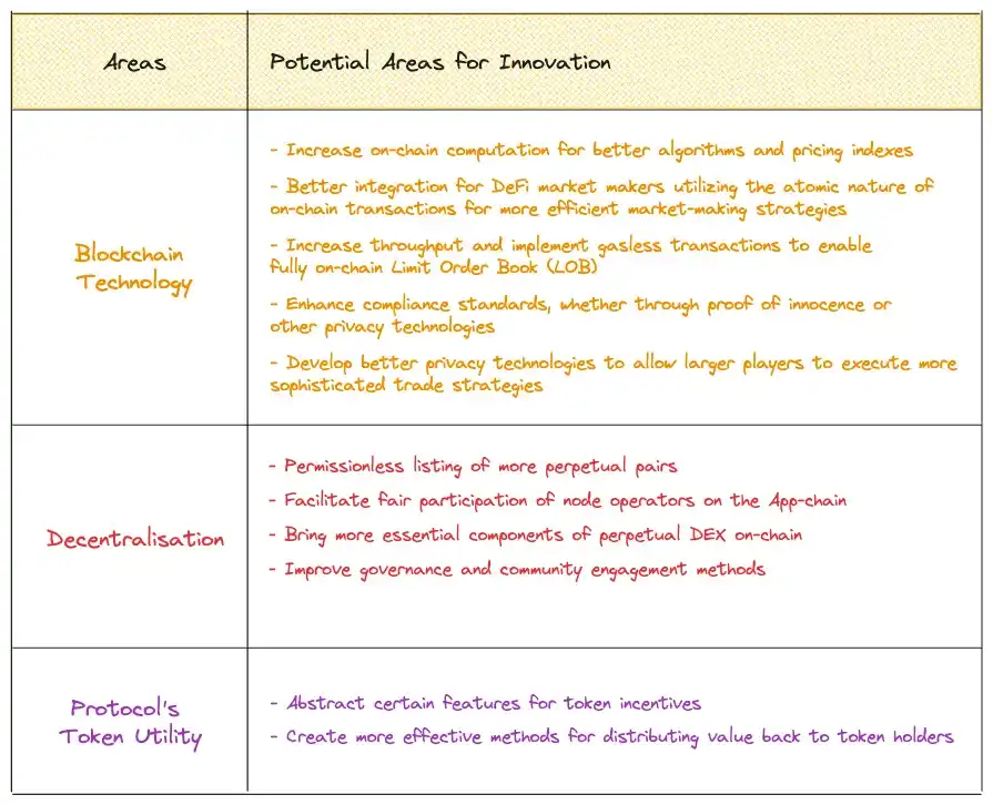 这些永续去中心化交易平台的基本差异催生了多个 DeFi 创新,如通过 vAMMs 和流动性池的独特交易模式,与传统的 LOB 模型不同。因此,我们正关注这三个领域的创新潜力: