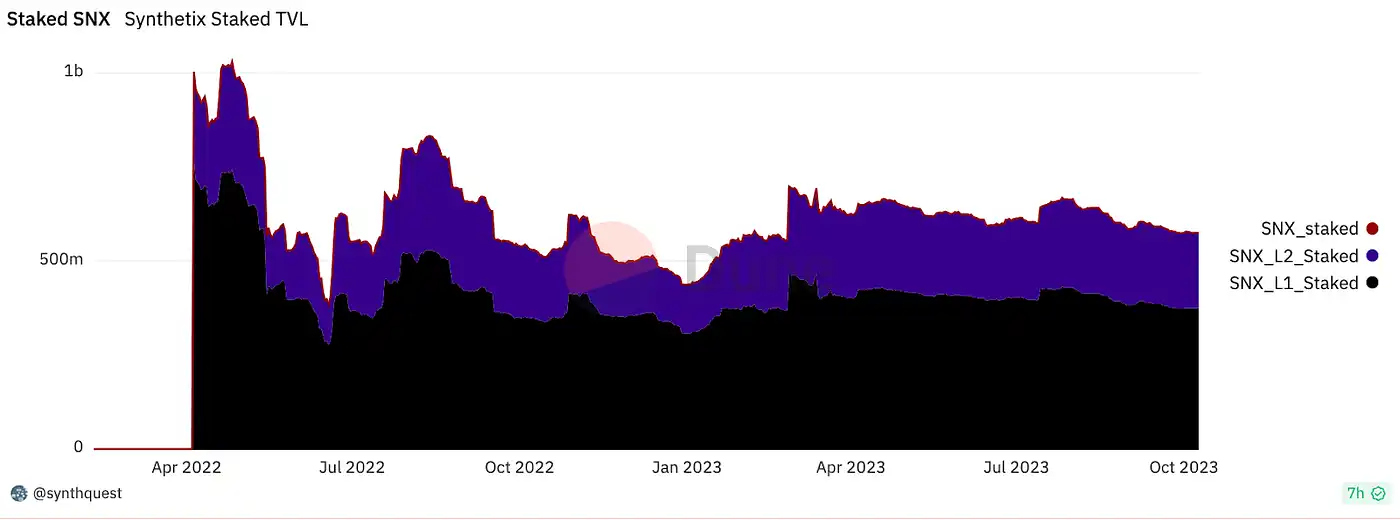 此外,Synthetix 的本地代币$SNX 在 Synthetix 债务池的抵押品中起着至关重要的作用。目前,约 93% 的$SNX 已被抵押,抵押总值约为 5.73 亿美元,完全摊薄的估值为 6.17 亿美元(截至 2023 年 10 月 10 日)。