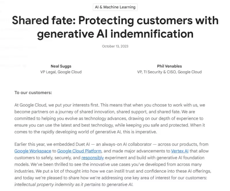 这意味着,如果某人因使用涉及受版权保护的材料的谷歌训练数据而对某人采取法律行动,谷歌将承担解决这一法律挑战的责任。