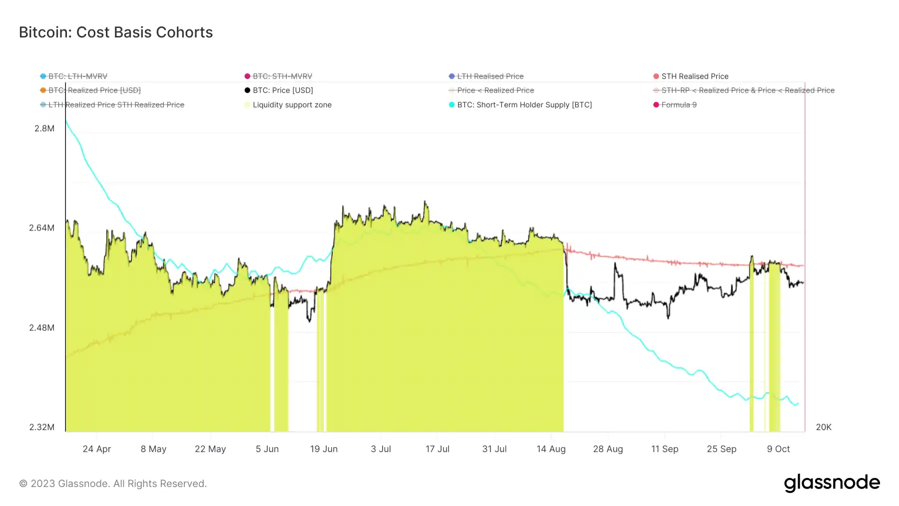 在 BTC 市价低于短期参与者的成本持有价格时,可能市场会迎来⼀定程度的低迷修复阶段。