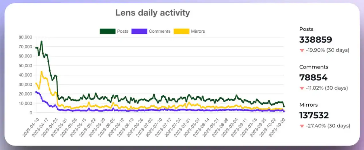 截至 2023 年 10 月 12 日的 Lens 指标 - https://dune.com/pixelhack/farcaster