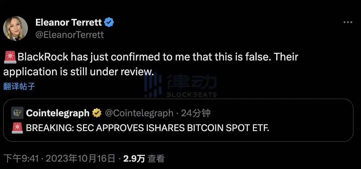 福克斯记者:ETF 获批为假消息,已向贝莱德证实,目前申请仍在审查中