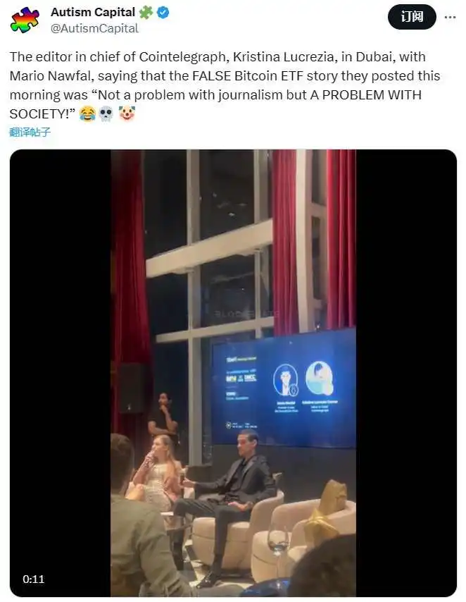 10 月 17 日,加密 KOL Autism Capital 在社交媒体发布 Cointelegraph 主编 Kristina Lucrezia 就此前「比特币现货 ETF 获批」假消息报道的回应,Lucrezia 在该视频中表示「这不是新闻业的问题,而是社会和社交媒体的问题。在这里,如果你不是首发,那就意味着是最后一名。这就是在 Cointelegraph 不断受到追求每一则新闻首发压力时会发生的事情。」