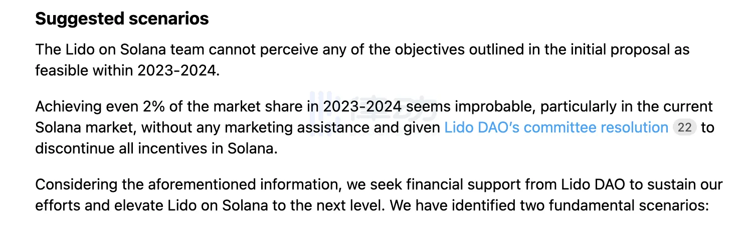 事实上,Lido 退出 Solana 在 9 月便已初见端倪。9 月 5 日,Lido on Solana 项目团队向 Lido DAO 社区提交了一份提案,寻求财务支持以继续其在 Solana 上的发展努力。其在提案中表示,「自 2022 年 3 月从 Chorus One 接手项目以来,团队已在产品和业务发展方面取得了显著进展。然而,由于 2022-2023 年团队在 Lido on Solana 项目上的投资约为 70 万美元,而收入仅为 22 万美元,导致了 48.4 万美元的亏损。」