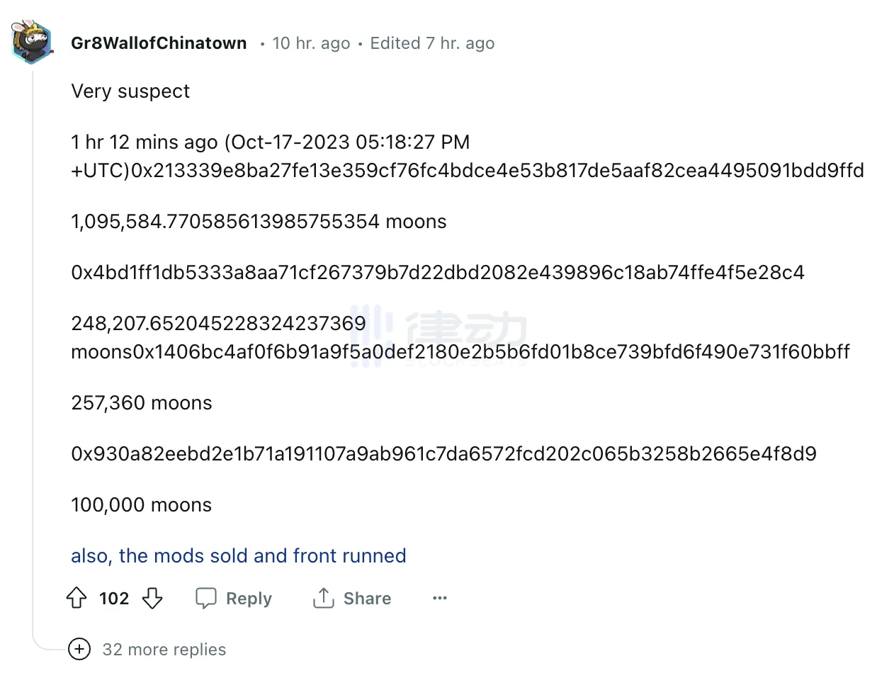 随之而来的是对 rug 的猜测,「价格在到达我的收件箱之前几个小时就暴跌了,所以肯定是有一些不正当的事情发生了」,「如果 Reddit 在新闻发布之前就抛售了,那就有点令人讨厌了。他们确实持有大量代币」。社区在链上看到了非常可疑的交易记录,指出有地址在「取消 Token 积分」的通知之前,就完成了大笔的卖出,实现了「逃离」。