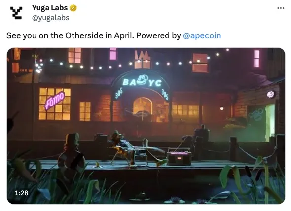 Otherside 是 Yuga Labs 旗下的元宇宙项目,承载了 Yuga Lasb 在 NFT 领域的宏大构想。2022 年 3 月,Yuga Labs 在社交媒体上公布其新项目「Otherside」的宣传视频,视频内出镜的 NFT 系列包括 Bored Ape Yacht Club、CryptoPunks 等著名品牌。