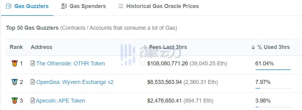 Otherside 正式启动于北京时间 5 月 1 日零时,Otherside 铸币活动一度导致 Etherscan 无法访问。据 etherscan 数据显示,从北京时间 5 月 1 日早上 9 点开始,过去三小时 The Otherside 上 OTHR Token 产生的 Gas 费用近 4 万 ETH,超 1 亿美元,占到以太坊全网 Gas 费用的 61%。