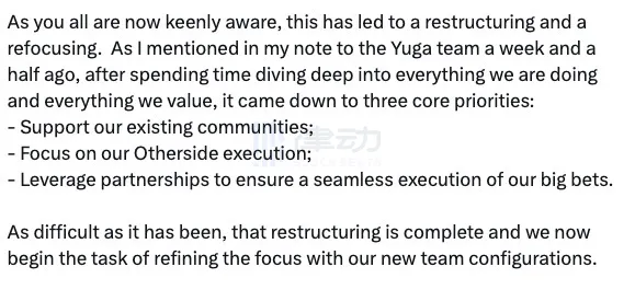 10 月 18 日,Yuga Labs 首席执行官 Daniel Alegre 发表了一篇长推,表示公司的重组已经完成。