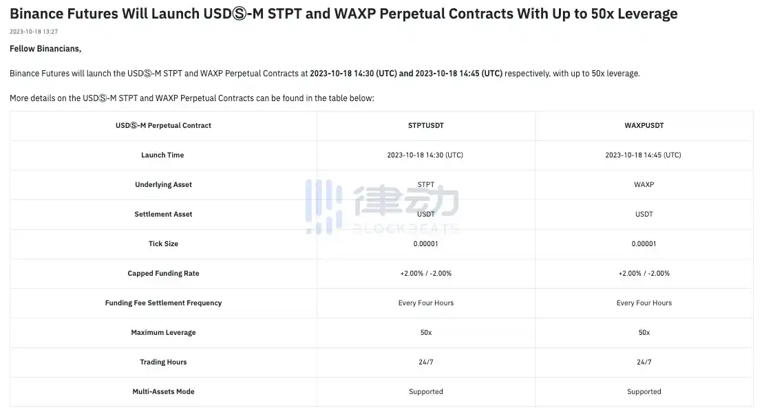 据官方公告,Binance 将于 2023 年 10 月 18 日 22:30(东八区时间)上线 STPT 1-50 倍 U 本位永续合约,并于 2023 年 10 月 18 日 22:45(东八区时间)上线 WAXP 1-50 倍 U 本位永续合约。其中:
