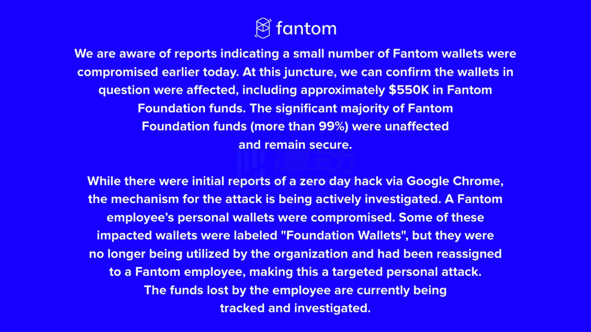 Fantom 基金会正式确认,此前有少数 Fantom 钱包被盗,其中包括约 55 万美元的 Fantom 基金会资金。尽管最初有报道称此次攻击是通过 Google Chrome 的零日漏洞进行的,但具体的攻击机制仍在积极调查中。