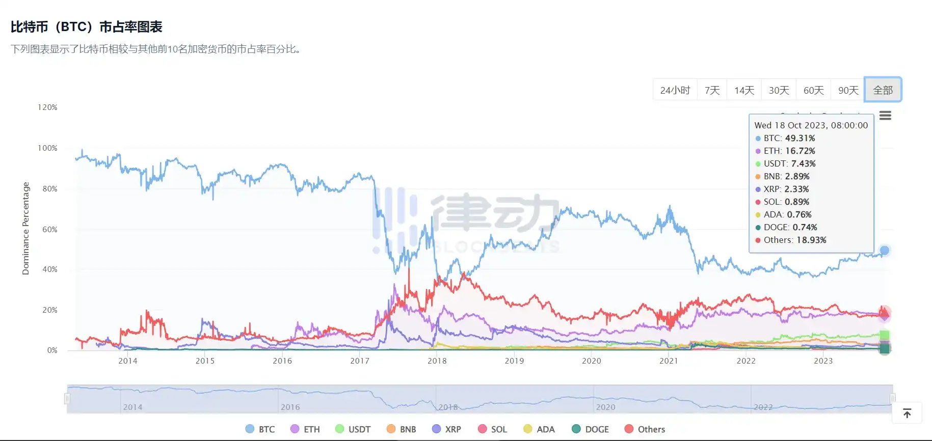 比特币市占率升至 2021 年 4 月以来新高,暂报 49.31%