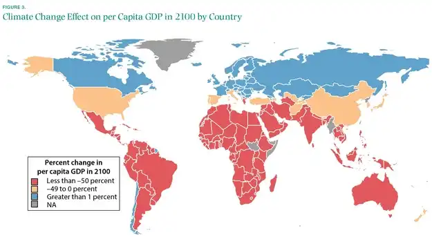 Odaily 星球日报注:气候变化对于不同经济体 GDP 的潜在影响
