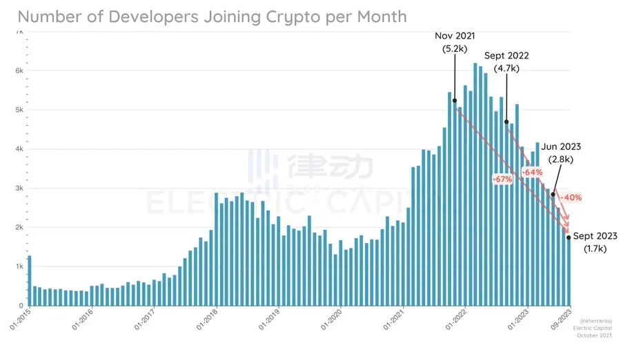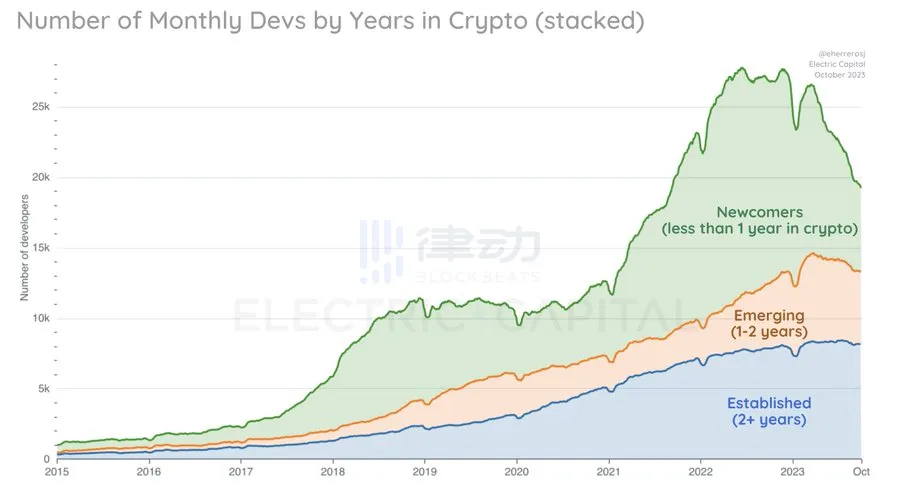 Electric Capital 于 10 月 19 日在社交媒体平台发布了更新的十月开发者数据分析,通过数据表明 2023 年探索加密货币的新开发者数量减少。 将更新内容整理编译如下: