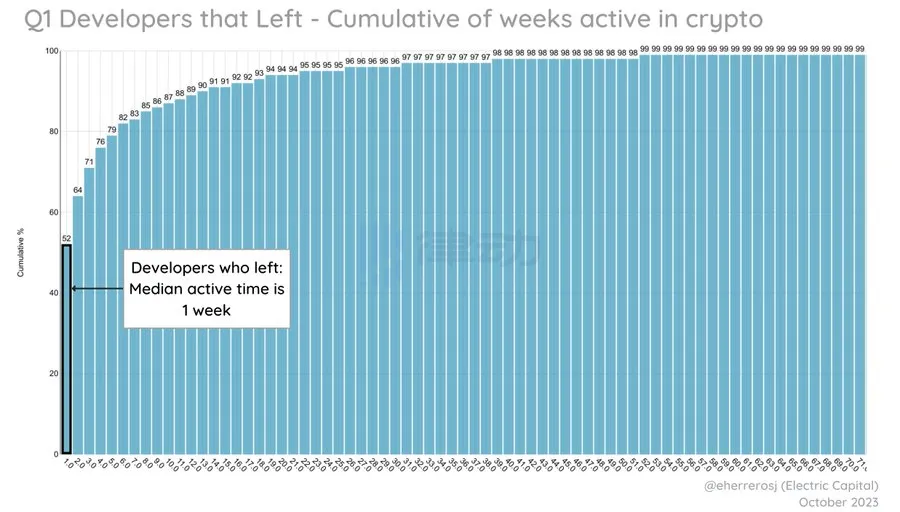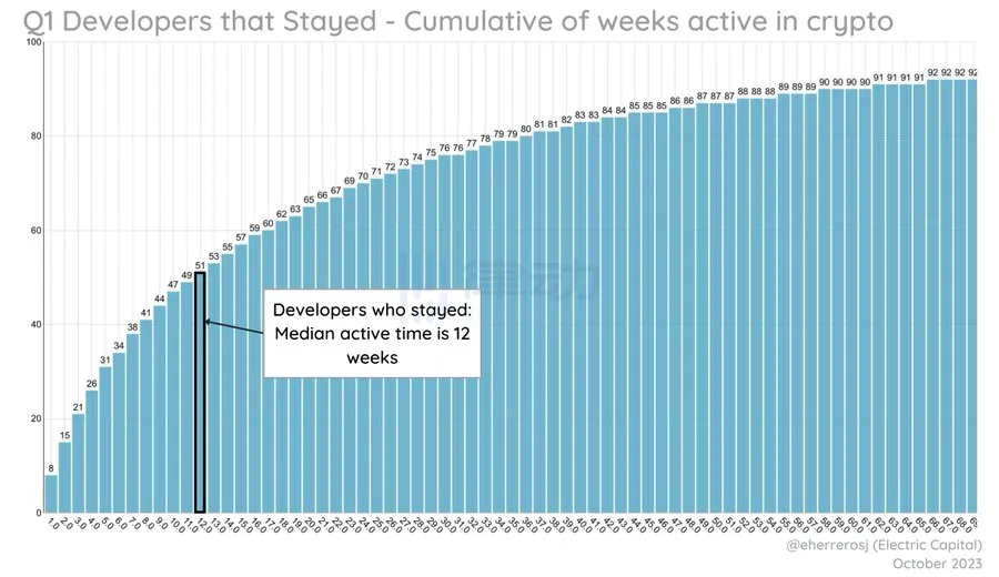 在加密领域工作 1 年以上的开发者继续贡献,而许多新手则离开了