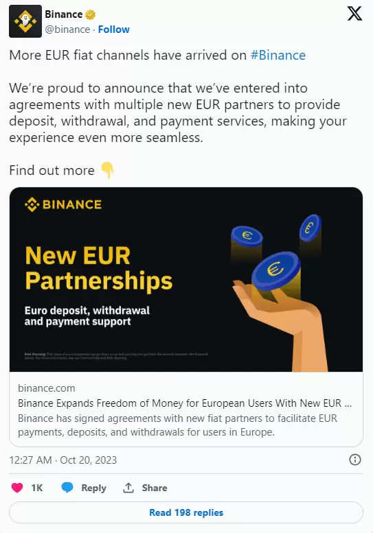 在 10 月 19 日的一份声明中,币安宣布已与新的法币合作伙伴签署了欧元支付、存款和取款协议。