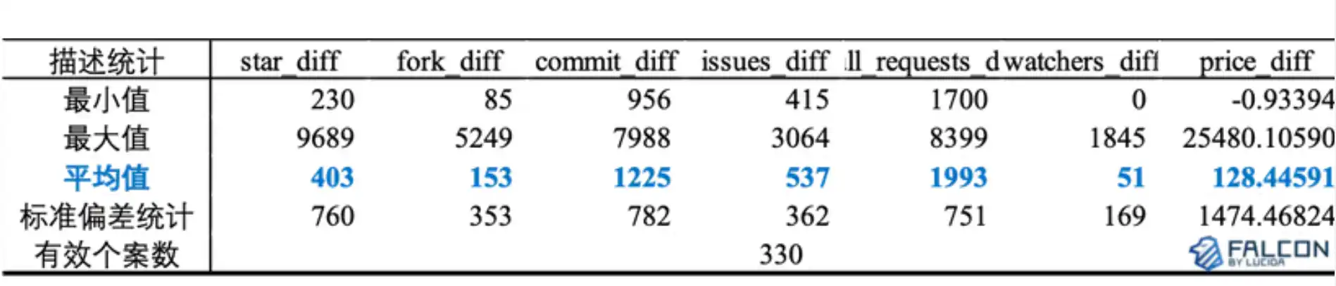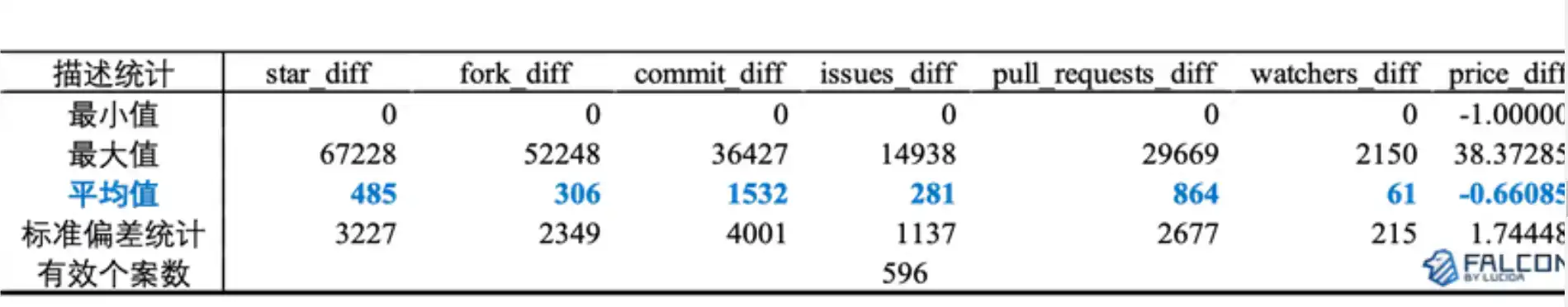 GitHub 数据六因子及币价涨跌幅的描述统计: