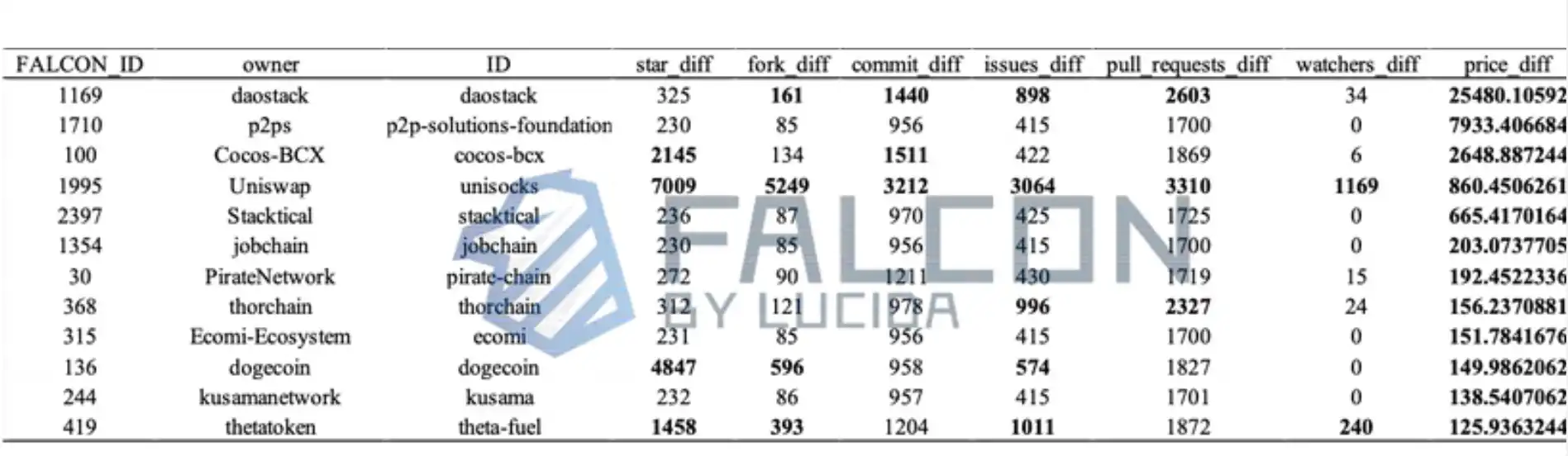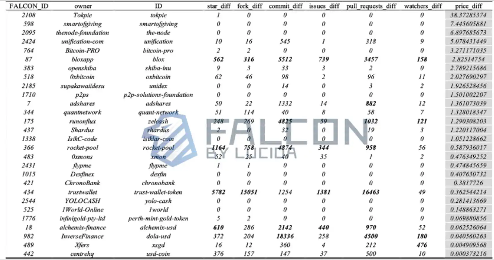 该区间币价涨幅超过平均涨幅值(黑色加粗)的币价及其对应的 GitHub 数据六因子的统计情况: