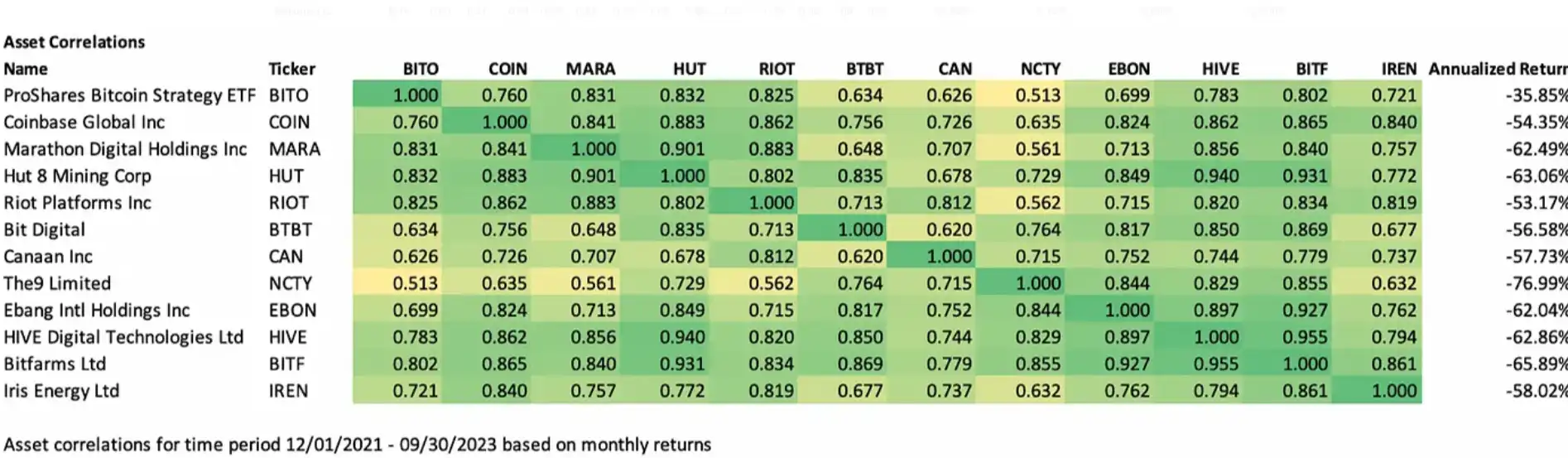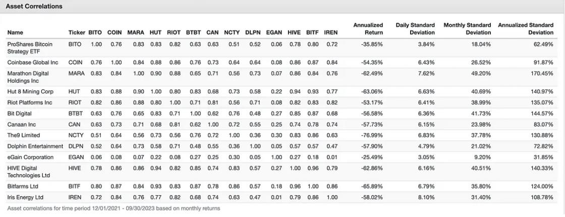 各矿股和 BITO 价格相关性和标准差(BITO 拟合 BTC 价格)
