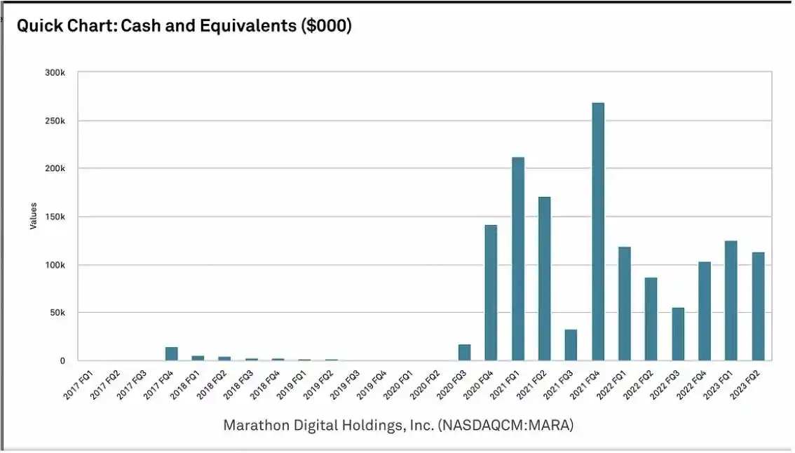 虽然由于算力增加挖出 BTC 效率增加,改善了收入情况,但 Marathon 在截至 2023 年 6 月 30 日的三个月内录得了亏损 2130 万美元,每股亏损 0.13 美元,相比去年同期净亏损为 2.126 亿美元,每股亏损 1.94 美元情况有所提升,然而依旧无法盈利,庞大的电费和矿场部署的费用在现金流紧缺的情况下继续削弱 Marathon 的资产负债表。