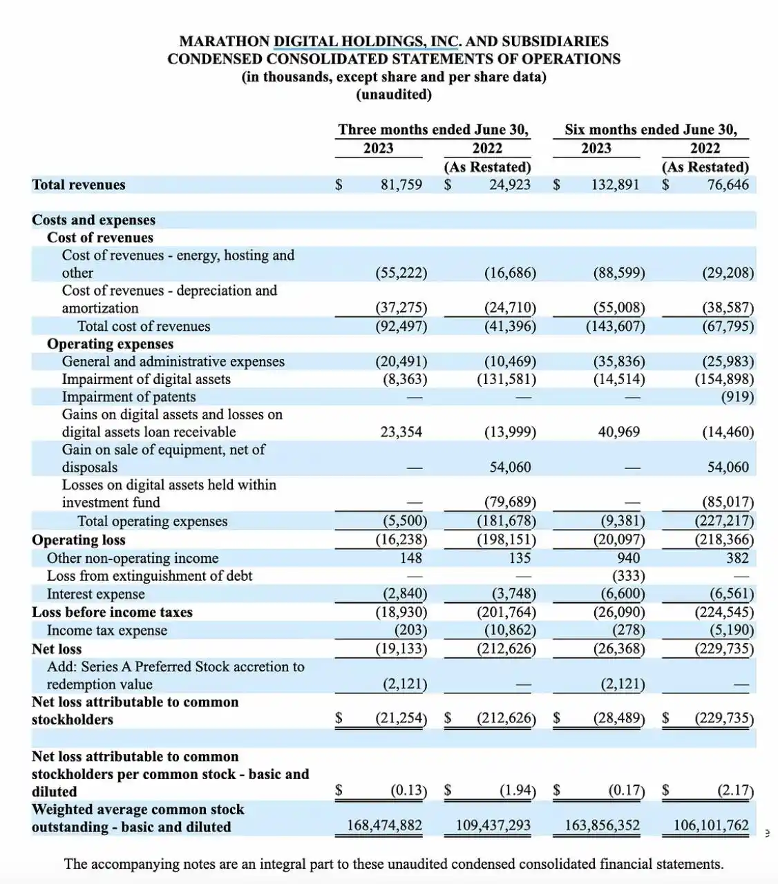 2023Q2 Marathon 录得 1913 万美元的净亏损,相比之下,去年同期为 2126 万美元的净亏损。约为 91% 的净亏损改善主要是由于数字资产出售的收益和数字资产减值的有利差异以及与数字资产减值和投资基金内数字资产损失相关的有利差异,部分抵消了较低的总利润率。
