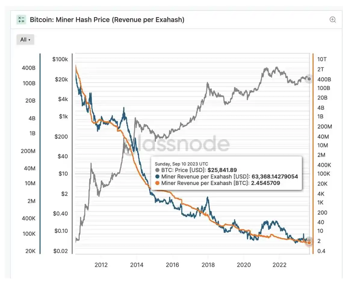 比特币价格和网络难度出现显著分歧,牛市中市场奖励矿工的未来算力,成为矿工牛市筹集资金的重要叙事,但在熊市中,随着比特币价格下跌,算力的增长使得矿工经济状况非常具有挑战性,因为矿工必须在 BTC 价格大幅下跌,算力仍然继续增长的情况下购买他们之前签署的矿机订单。矿工已经支付了矿机的资本支出,所以从他们的角度来看,只要他们的边际挖矿成本仍然是正的,继续执行增长计划是有道理的。这一趋势进一步加剧了今年年初以来哈希价格的大幅下跌。