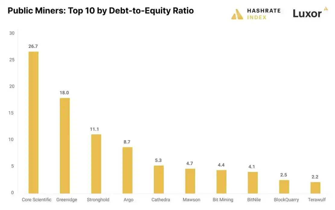 挖矿股在熊市面临严峻的挑战,和 BTC 的强相关性和高弹性特征也导致其价格在熊市下行压力更大,由于高杠杆的运营模式,收益来源单一的挖矿上市公司同时存在破产威胁。许多比特币挖矿上市企业在 2021 年的牛市期间大量贷款,导致他们在随后熊市期间的盈利状况受到非常负面的影响,事实上矿企中借款额最大,债务资产比最高的 Core Scientific 已经在 2022 年底寻求破产保护和债务重组,破产前的整个 2022 年,Core Scientific 都在卖出 BTC 以应对其矿机购买成本,自营矿场建设支出,大规模部署矿机电费以及贷款利息等运营成本,但是最终还是由于其激进的 2022 年扩张计划(在 2022 年年底部署超三十二万台矿机,每天光电费即损失 53000 美元)以及 Celsius 事件影响宣布破产。